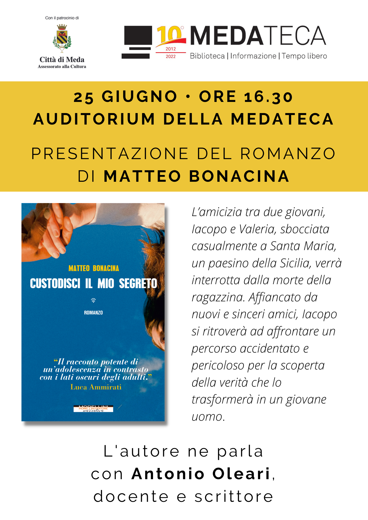 Sabato 25 giugno 2022 ore 16:30 presso l'Auditorium della Medateca presentazione del romanzo di Matteo Bonacina Custodisci il mio segreto