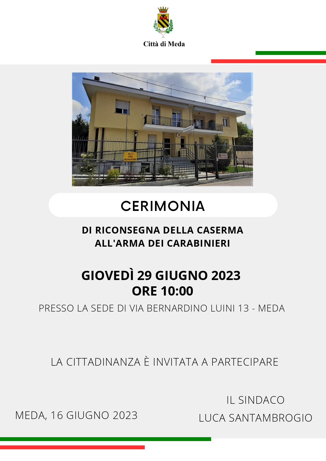 Il Sindaco invita la Cittadinanza a partecipare alla cerimonia di riconsegna della caserma all'Arma dei Carabinieri giovedì 29 giugno alle ore 10:00