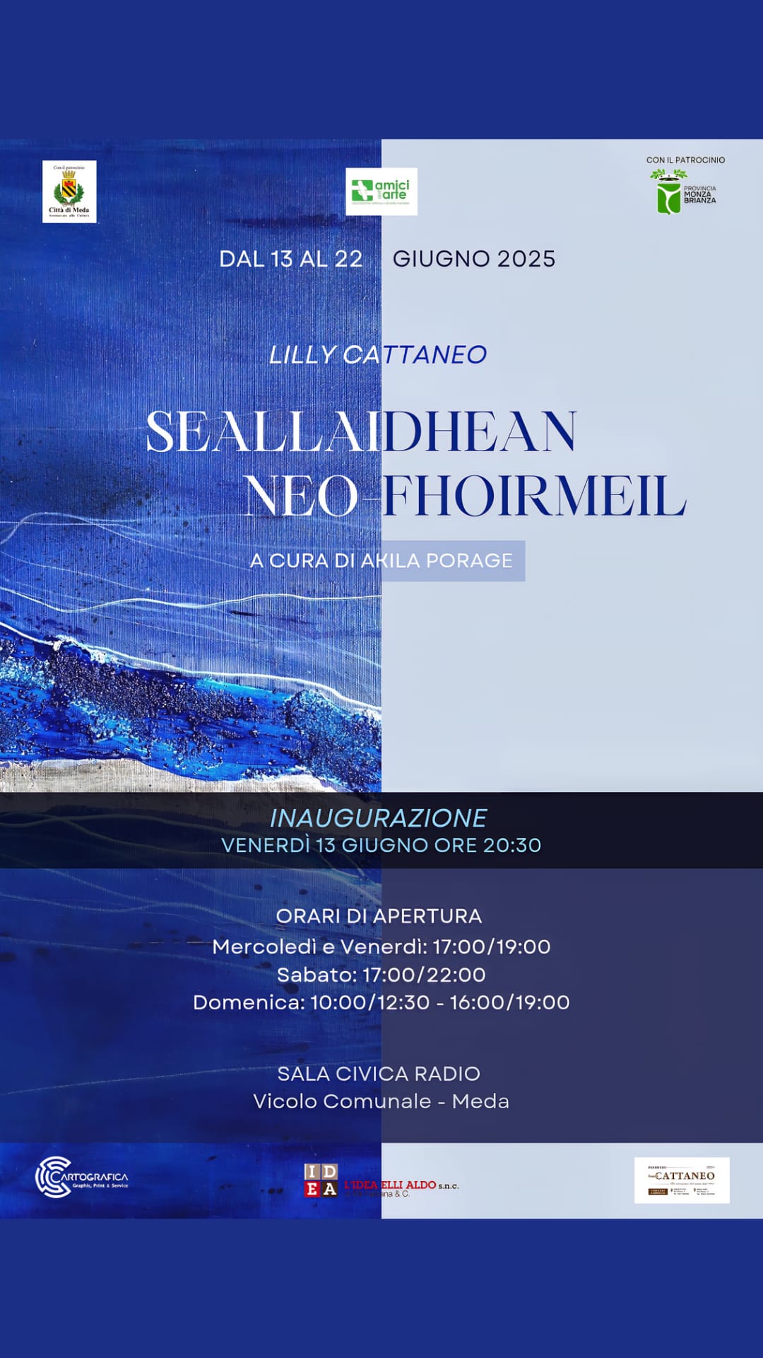 Dal 13 al 22 giugno 2025, la Sala Civica Radio di Meda ospita Seallaidhean Neo-Fhoirmeil, mostra personale dell’artista Lilly Cattaneo, a cura di Akila Porage. Il titolo, in gaelico scozzese, significa "orizzonti informali" e suggerisce un’esplorazione dell’arte libera da regole, dove il gesto pittorico si fa espressione autentica e istintiva. In un dialogo intenso tra materia e luce, l’artista propone opere che parlano di paesaggi interiori, astrazioni liriche e libertà compositiva.