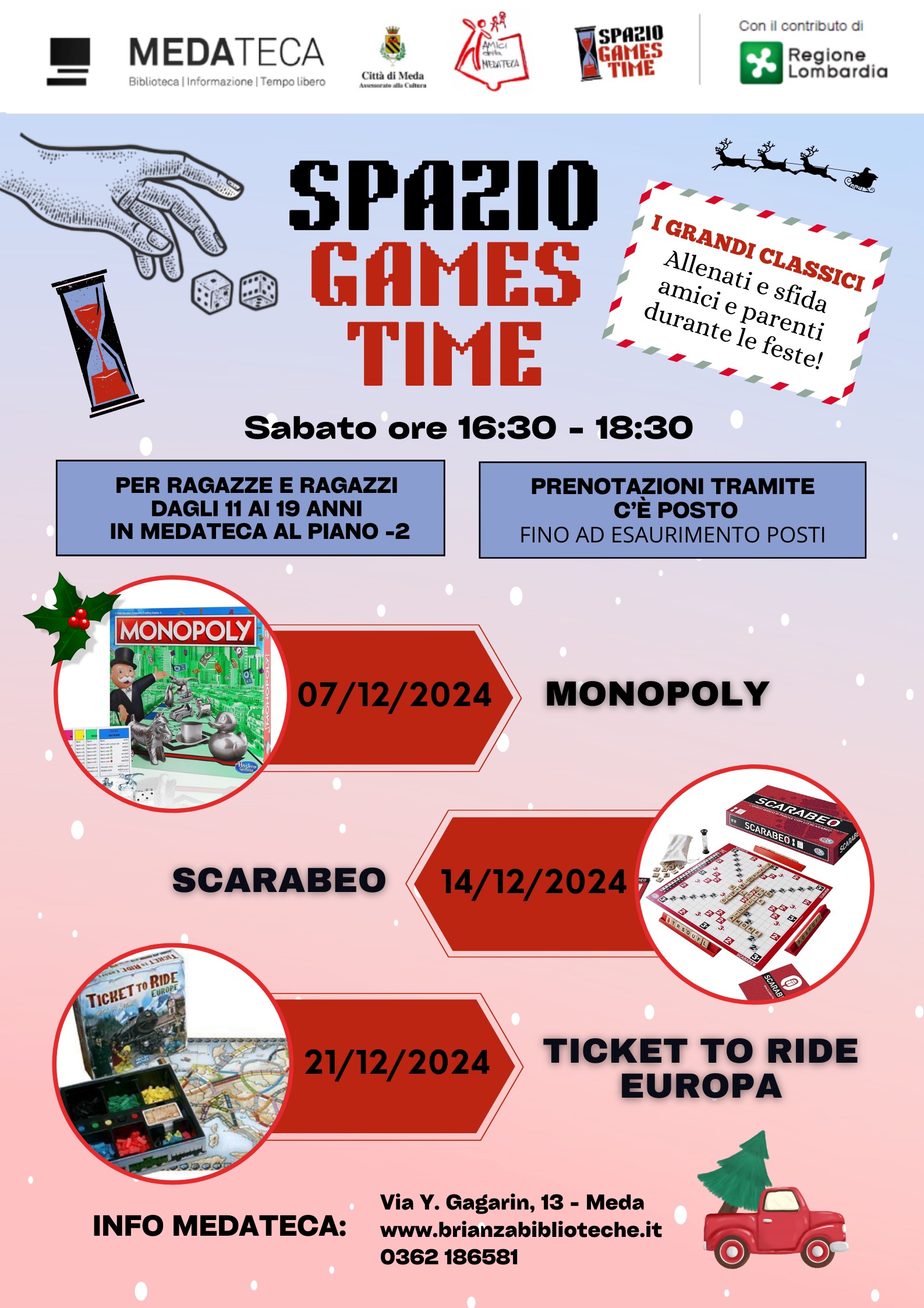 Il secondo appuntamento, per ragazze e ragazzi da 11 a 19 anni, si svolgerà sabato 21 dicembre dalle ore 16:30 alle ore 18:30, al piano -2 della Medateca, presso lo Spazio Games Time.