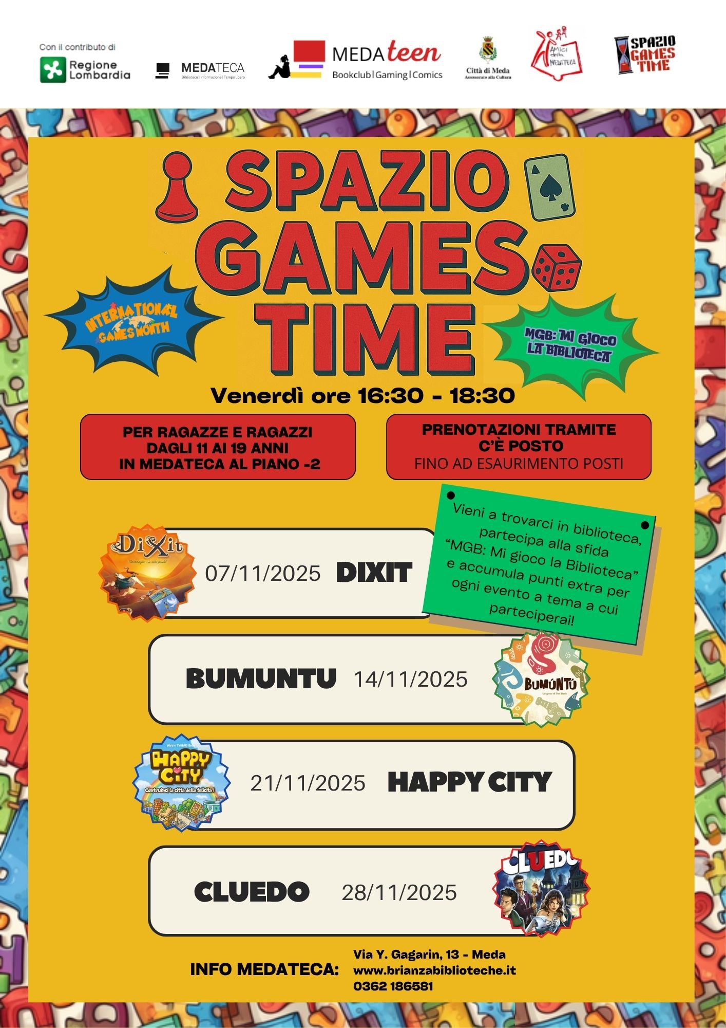 Durante il mese di novembre 2025, in occasione del mese internazionale del gioco, lo Spazio Games Time vi aspetta con una serie di incontri per la sfida "MGB: Mi Gioco la Biblioteca".