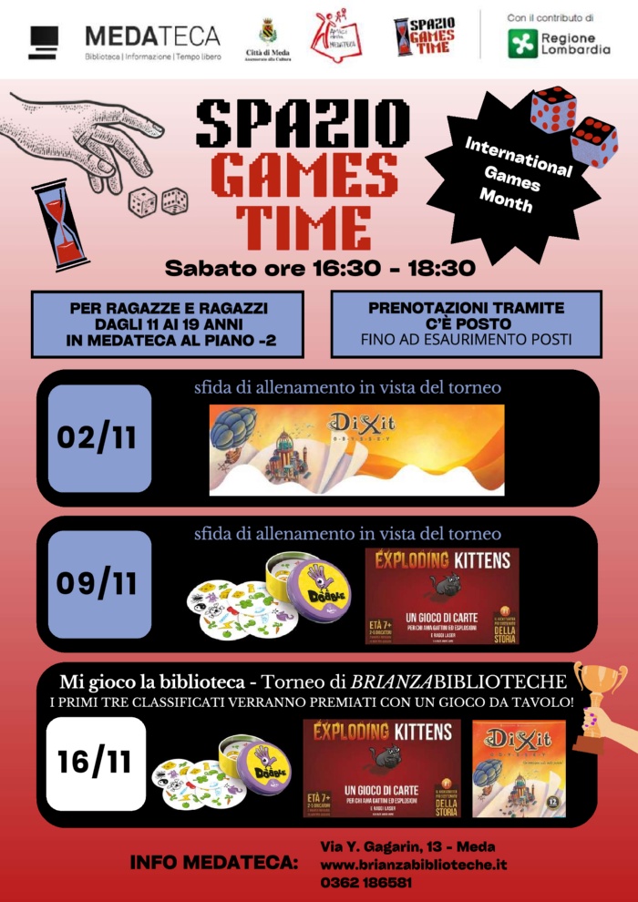 Durante il mese di novembre 2024, in occasione di International Games Month, lo Spazio Games Time il torneo "Mi gioco la biblioteca" promosso dal sistema bibliotecario BRIANZABIBLIOTECHE.