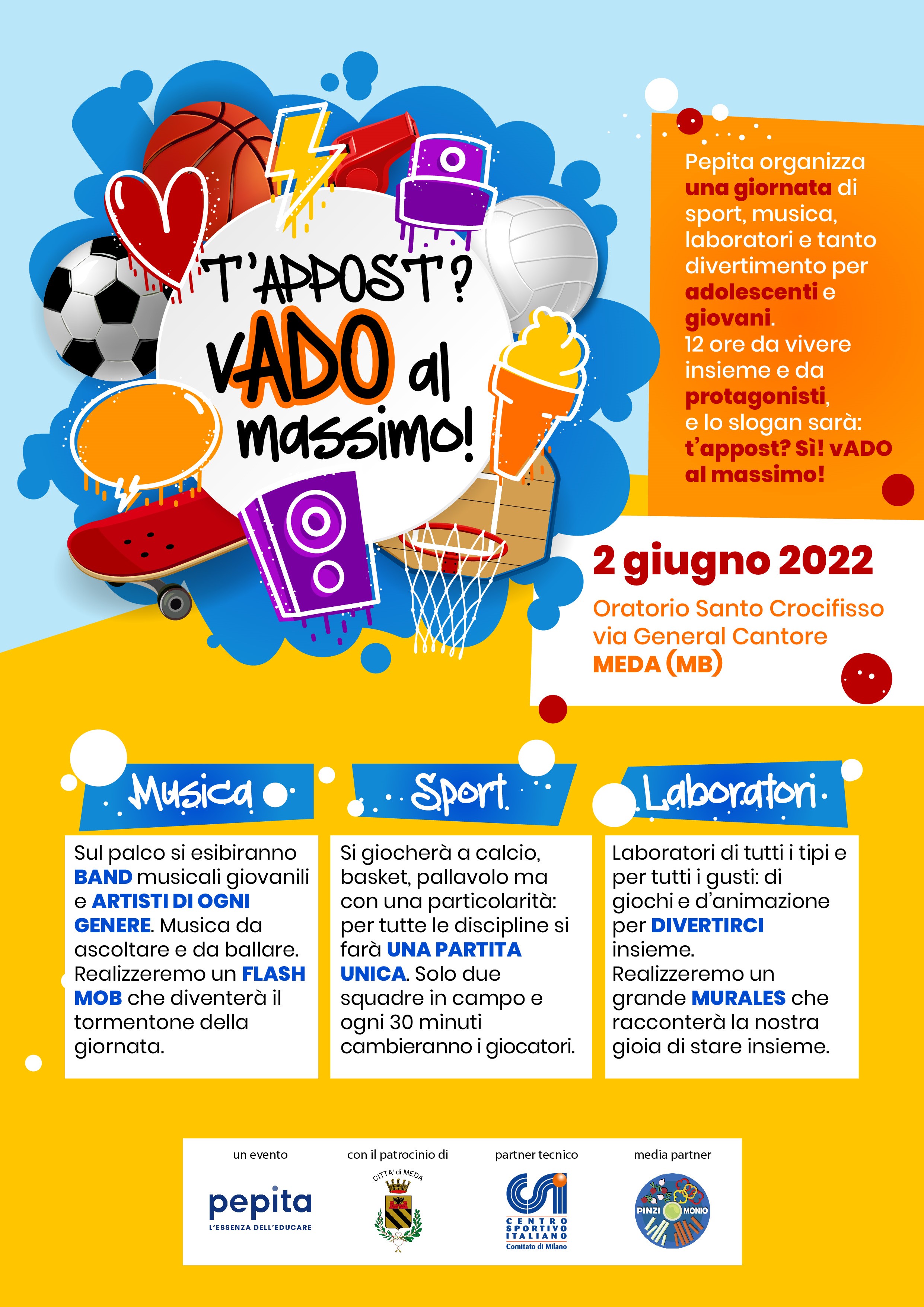 La società cooperativa sociale Pepita onlus organizza un evento sportivo, una no stop di 12 ore di competizioni di diverse discipline quali il calcio, il basket ed il volley oltre a momenti conviviali e di aggregazione, di socializzazione e lavori di gruppo, di performance artistiche quali concerti musicali, murales, teatro, animazione varia e che vedrà coinvolti ca 900 adolescenti medesi e di altre realtà locali.