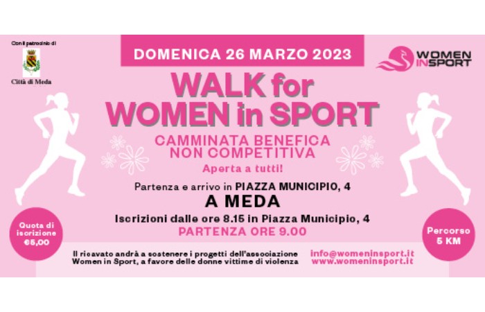 Walk for women in sport, è una camminata benefica non competitiva aperta a tutti, promossa dall'Assessore alle Politiche femminili A. Villa. L'iniziativa che si svolgerà il 26 Marzo, prevede un percorso di 5 km. E' organizzata dall'Associazione Women in Sport per sensibilizzare sulla tematica della violenza alle donne. Il ricavato sarà devoluto a favore dei progetti a sostegno delle donne vittime di violenza.