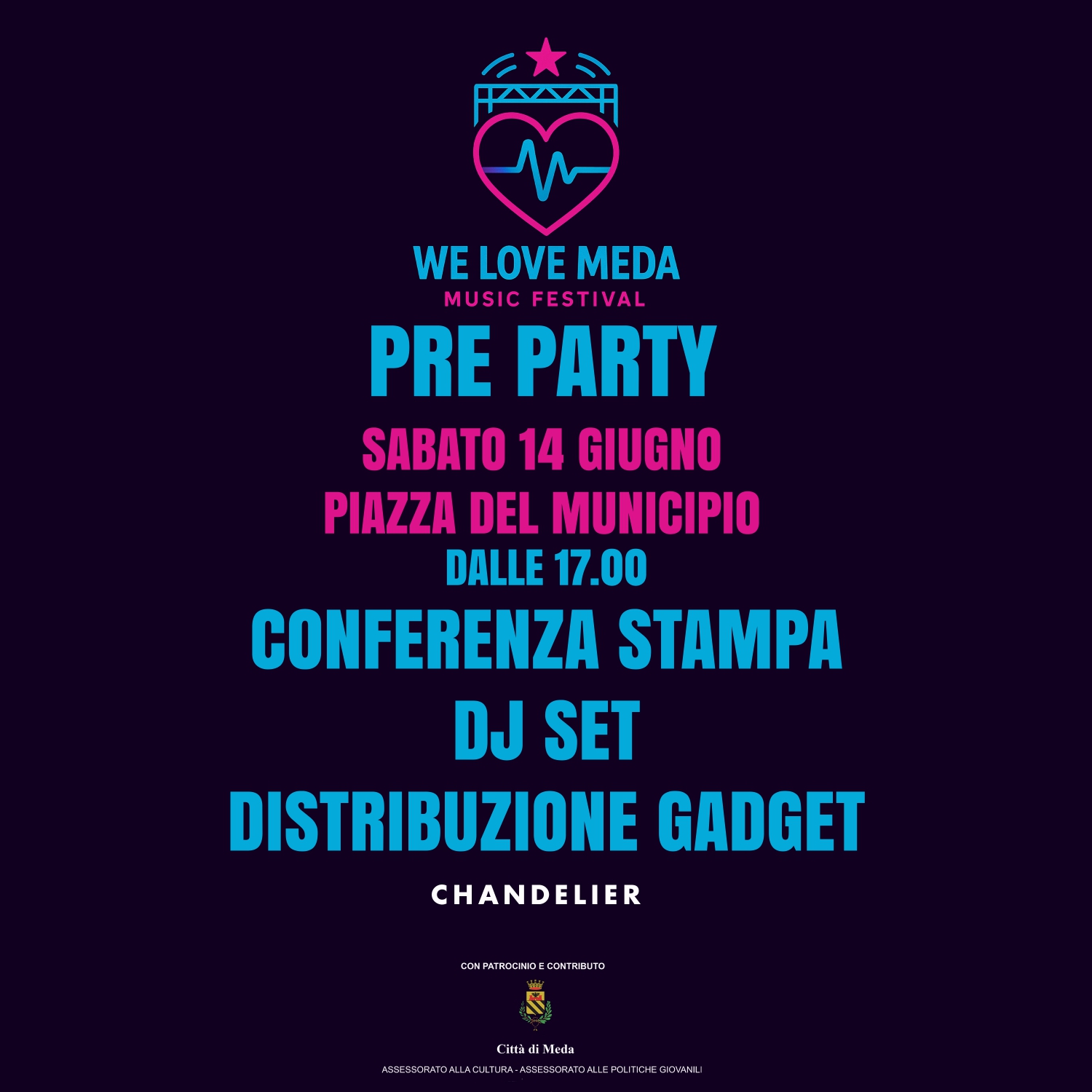 Il We Love Meda Music Festival scalda i motori con un imperdibile pre party sabato 14 giugno in Piazza del Municipio a partire dalle ore 17.00. Una serata ricca di energia con conferenza stampa, DJ set e distribuzione di gadget esclusivi! L’evento è ospitato dal Bar Chandelier, punto di ritrovo nel cuore della città. Un’occasione perfetta per vivere l’anteprima del festival e respirare l’atmosfera dell’estate medese.