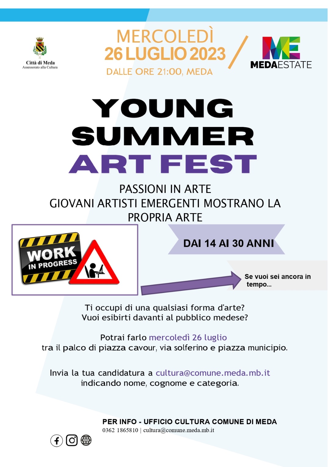 Dice l’Assessore alla Cultura, Fabio Mariani: “Vi invito a condividere, il più possibile, questa ottima opportunità dedicata agli artisti emergenti perché è un’occasione per potersi esprimere e mostrare il proprio talento. Un incentivo a promuovere i giovani che portano a Meda un’incredibile boccata d’aria fresca in queste serate estive.”
